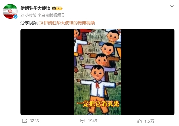 美国和以色列持续轰炸伊朗,美以伊战争仍在持续。伊朗驻华大使馆微博3月4日发布了一首中国20世纪60年代的儿歌——《美国佬是强盗》,痛批美国。