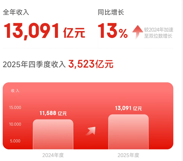 2025年四季度,京东集团收入3523亿元;全年收入13091亿元,同比增长13%,较2024年加速增长。
