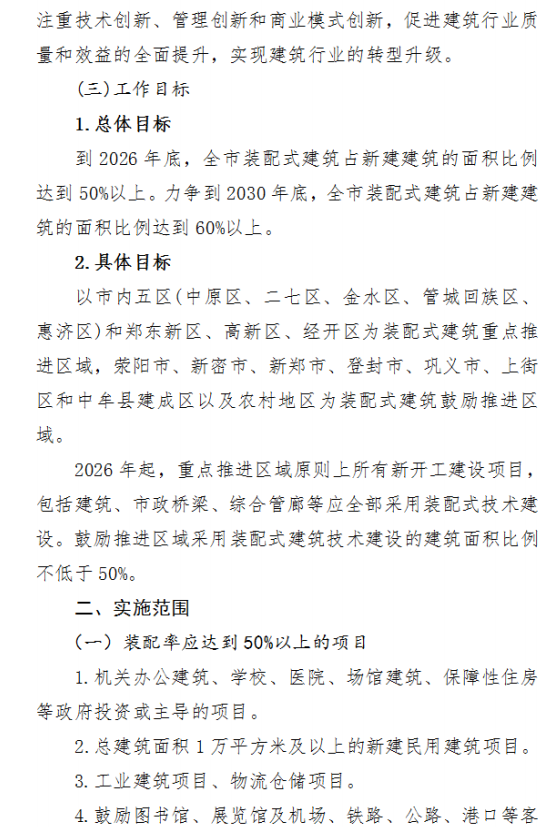 意见稿提出,到2026年底,郑州全市装配式建筑占新建建筑的面积比例达到50%以上。力争到2030年底,全市装配式建筑占新建建筑的面积比例达到60%以上。