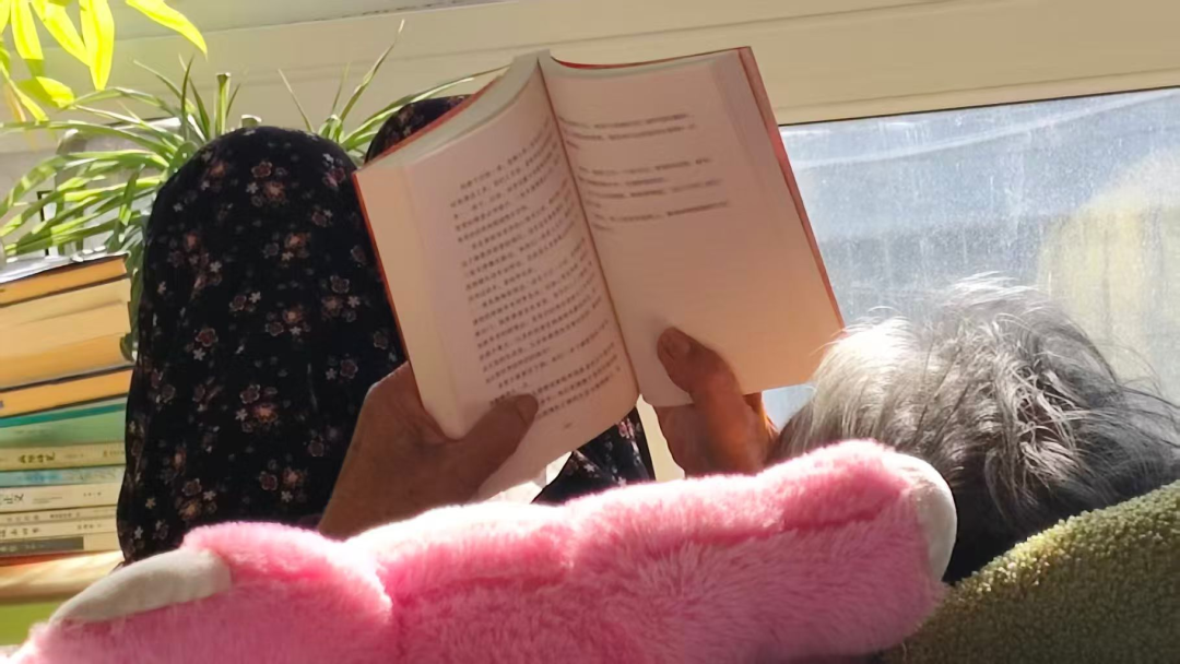 茸茸的姥姥柳树梅在家中翻阅《脐带纪事》实体书。(图/受访者供图)