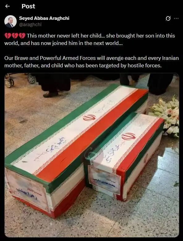 伊朗外长阿拉格齐发了一条推文,配图是一大一小两口棺木,里面是被炸死的妈妈和她的孩子。