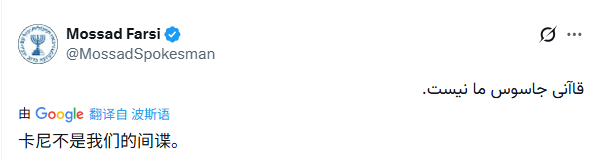 对此,2025 年 6 月 30 日,一个与摩萨德关联的 X账号,曾发布一条仅 6 个波斯语单词的帖文,直译为“卡尼不是我们的间谍”。