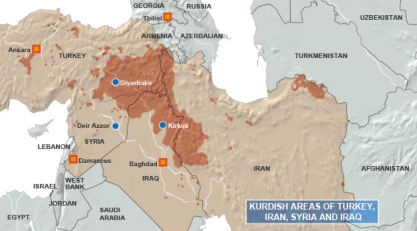 土耳其、伊朗、叙利亚和伊拉克境内的库尔德人聚居区,值得注意,在伊朗库尔德人聚集区北方就是阿塞拜疆人聚集区。美媒制图