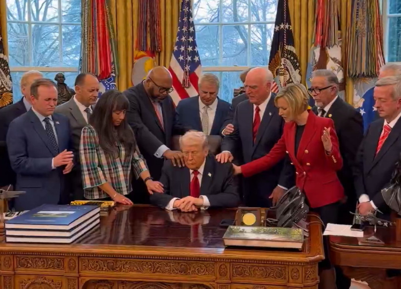 当地时间3月5日,特朗普在椭圆形办公室,与来自全美各地的牧师一同祈祷。