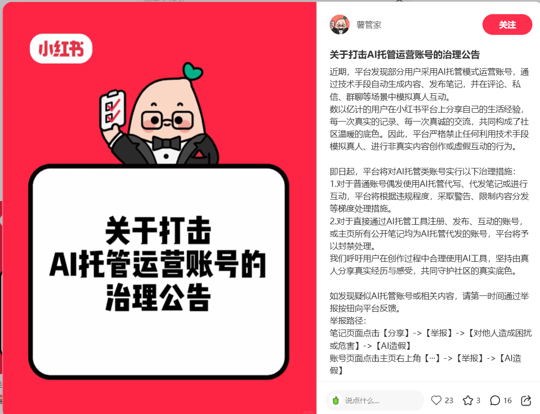 即日起,小红书平台将对AI托管类账号实行以下治理措施:
