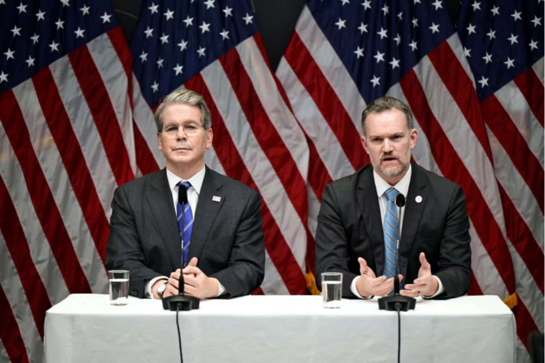 ◆2025年7月29日,美国贸易代表格里尔(右)与美国财政部长森特一同出席新闻发布会。(图源:路透社)