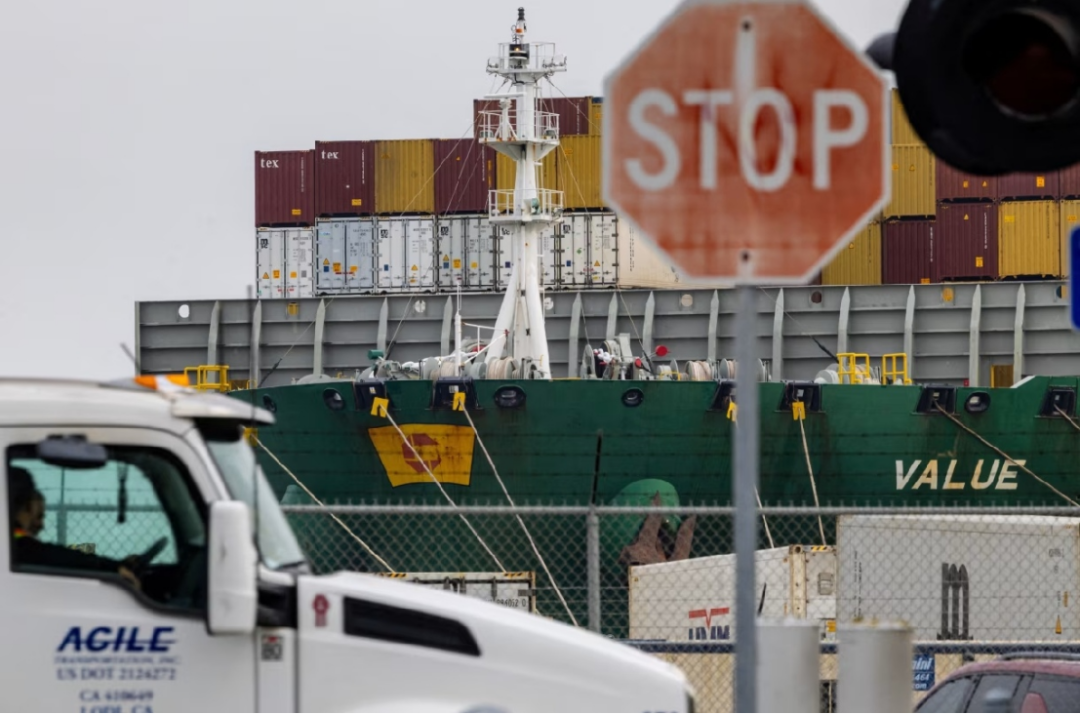 ◆2月23日,一艘满载集装箱的货船停靠在美国加利福尼亚州的奥克兰港口。(图源:路透社)