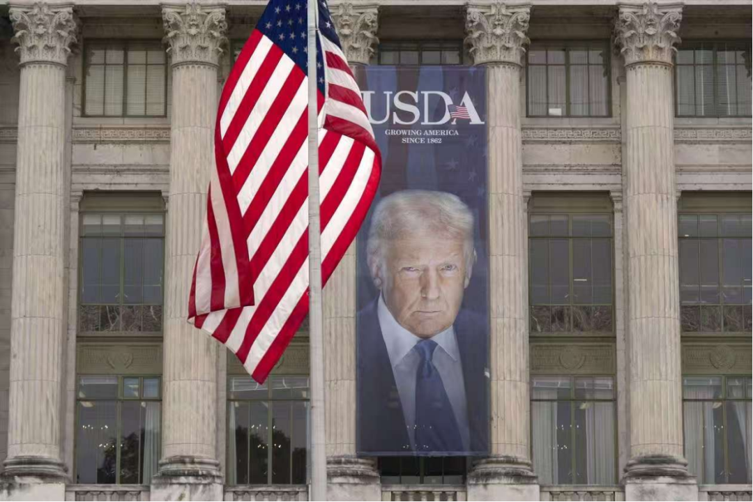 ◆2025年5月16日,美国农业部大楼悬挂海报,上面印有特朗普的照片。(图源:美联社)