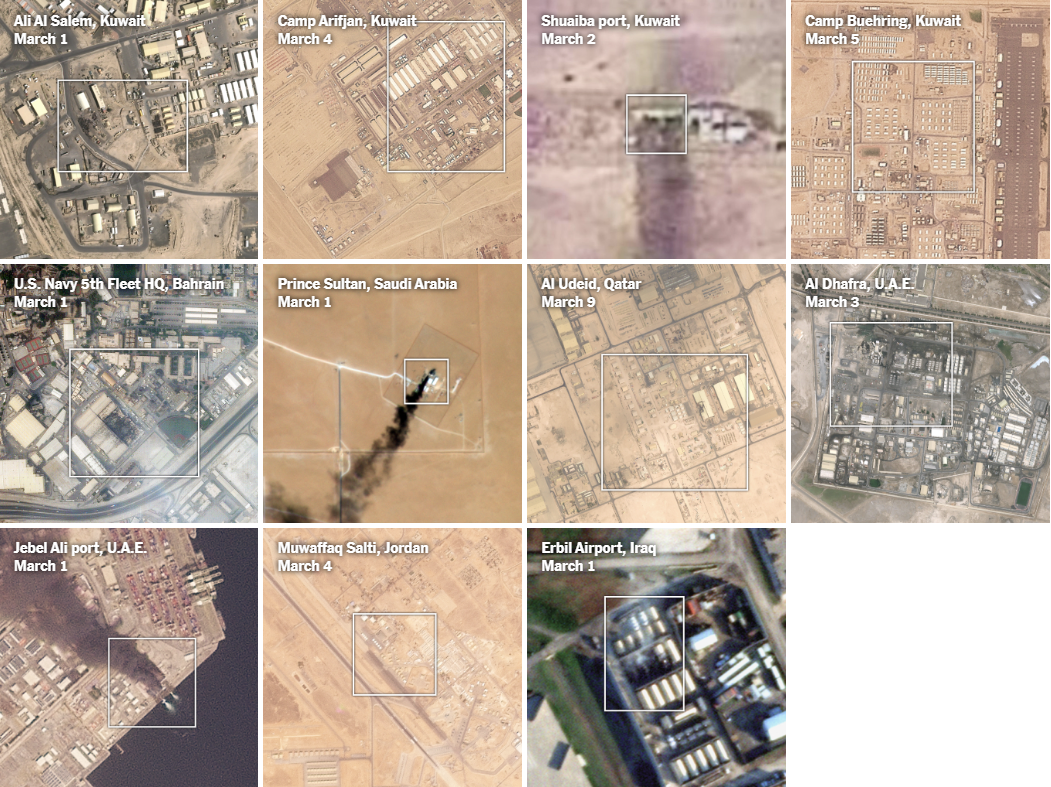 据《纽约时报》3月11日报道,美以联合袭击伊朗后,伊朗发起大规模反击,以无人机和导弹打击美军在中东各地目标。结合高分辨率卫星图像、经核实视频及双方官方声明,可以确认至少17处美国设施遭破坏,多处甚至遭到反复打击。