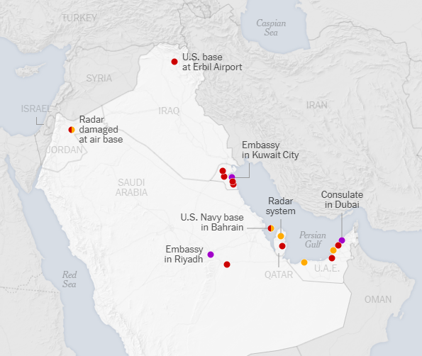 红色标识为遭打击的美军基地 橙色为防空设施 紫色为美使领馆
