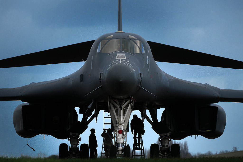 △当地时间3月11日,地勤人员在英国费尔福德皇家空军基地对美国空军B-1轰炸机进行作业