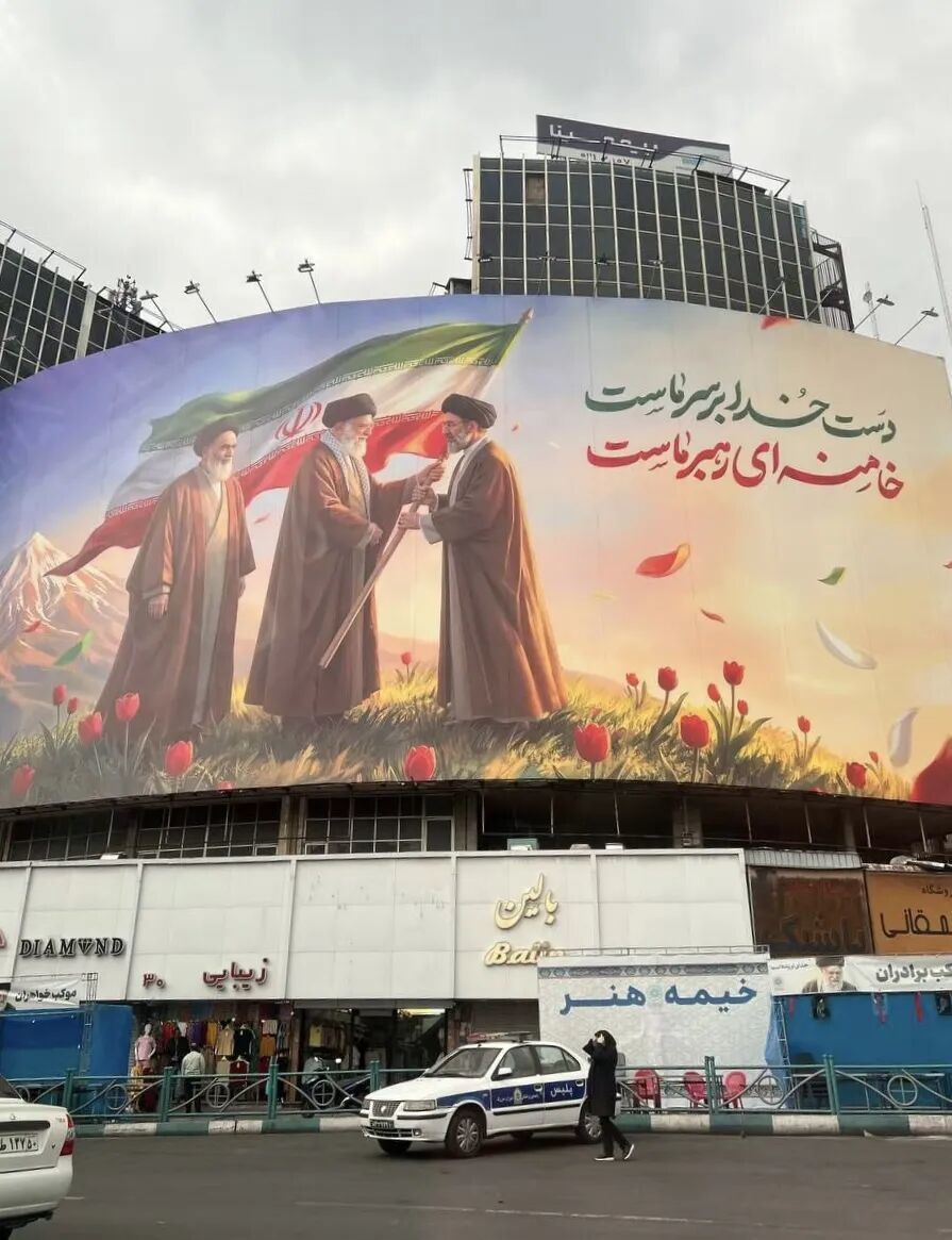 我们路过市中心瓦利亚斯大街,那里墙上有一幅很大的宣传画,是已故领袖哈梅内伊将国旗交到了他儿子手里,旁边还站着伊朗伊斯兰共和国的开国元首霍梅尼的画像。不知为何,这让我想起了古代波斯帝国的浮雕,众神将权杖交给了国王,那是最早的君权神授的概念。以前每到伊朗国内发生动荡,大家都会讨论后哈梅内伊时代的种种场景。没想到,后哈梅内伊时代,来得如此猝不及防,如此出人意料,伊朗迎来了第三位最高领袖——更年轻的哈梅内伊。