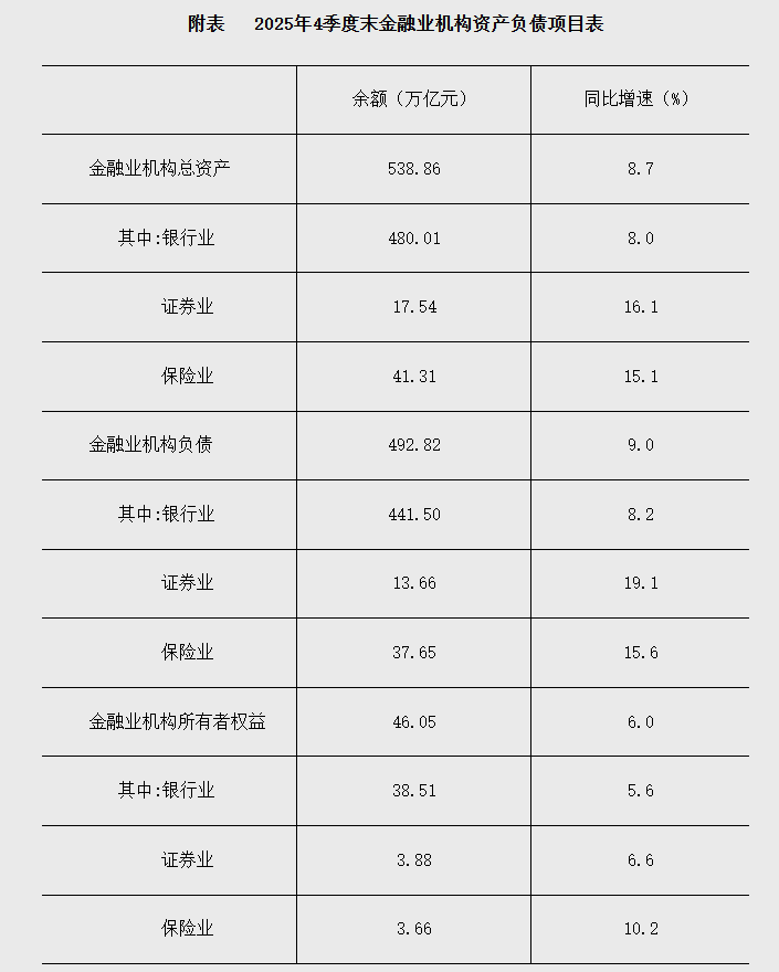 【大河财立方消息】 3月13日,央行数据显示,初步统计,2025年4季度末,我国金融业机构总资产为538.86万亿元,同比增长8.7%,其中,银行业机构总资产为480.01万亿元,同比增长8.0%;证券业机构总资产为17.54万亿元,同比增长16.1%;保险业机构总资产为41.31万亿元,同比增长15.1%。