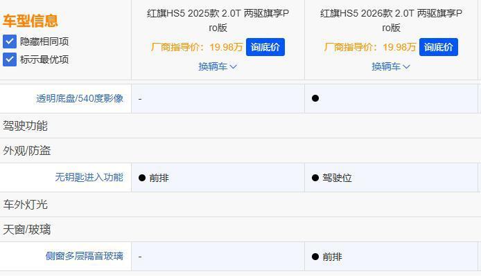 极目新闻记者通过汽车网站对比发现,红旗HS5 2.0T两驱旗享Pro版2025款与2026款核心配置一致,主要差异为后者增加侧窗多层隔音玻璃和540度影像透明底盘,两款车型官方指导价均为19.98万元。