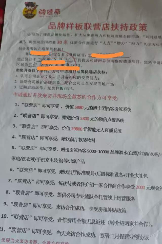 李先生提供的一份《品牌样板联营店扶持政策》显示:享受价值5980元的博士团拓客引流系统;赠送价值5800元的微信点餐系统;享受价值29800元的智能无人直播系统;赠送前厅软装物料;赠送引流拓客5000-10000瓶品牌酒水(白酒/红酒/水杯/小家电/洗衣液/手机充电装备)等引流产品;赠送前厅标准餐具+后厨标准设备+开业大礼包;每接待或者转介绍一家合作商,合作享受2000元现金补贴;提供公司专业团队全托管线上运营服务;享受房租补贴政策;合作费用全额无息返还(转介绍两家并合作);当天来访合作成功,签署三月保营业额协议等。