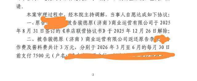 李先生称,他在2025年12月经济南市章丘区法院调解,“骏德原”返还他3万元,但至今一分没有收到。其他几家商户,同样没拿到钱。