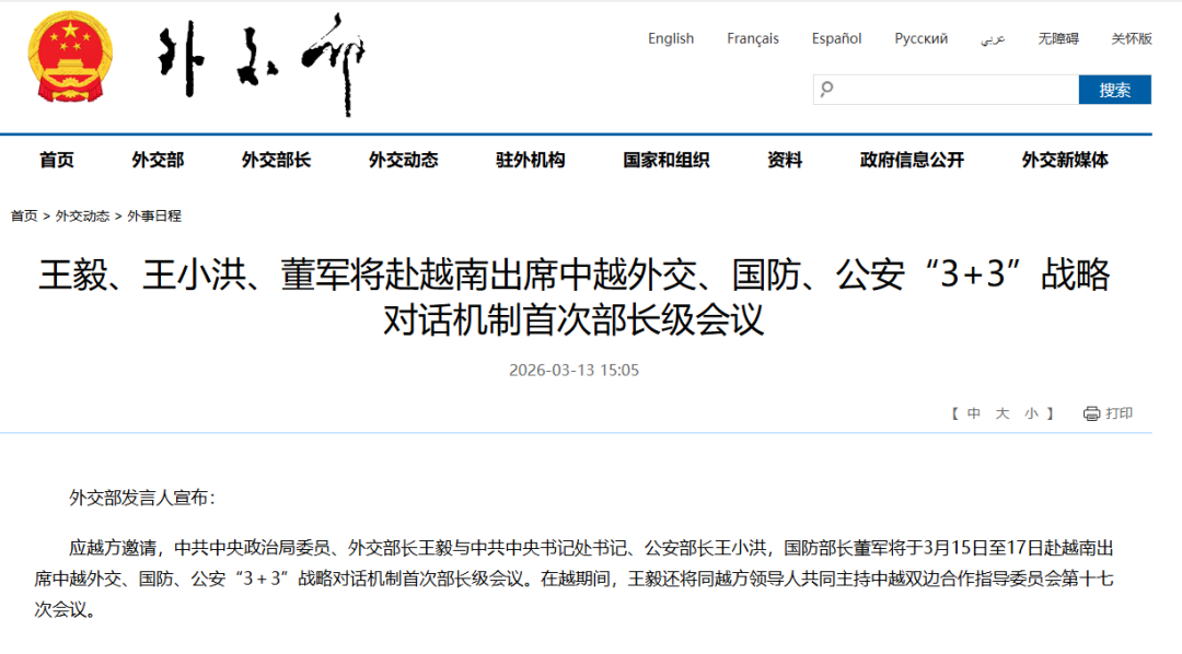 3月13日,中国外交部宣布,王毅、王小洪、董军将赴越南出席中越外交、国防、公安“3+3”战略对话机制首次部长级会议。
