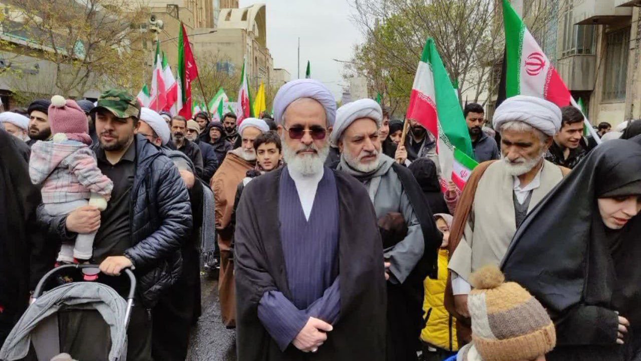 伊朗总统佩泽希齐扬走上街头,与大批民众一同参加集会游行。游行队伍声势浩大,民众高举旗帜、高呼口号,现场气氛热烈。