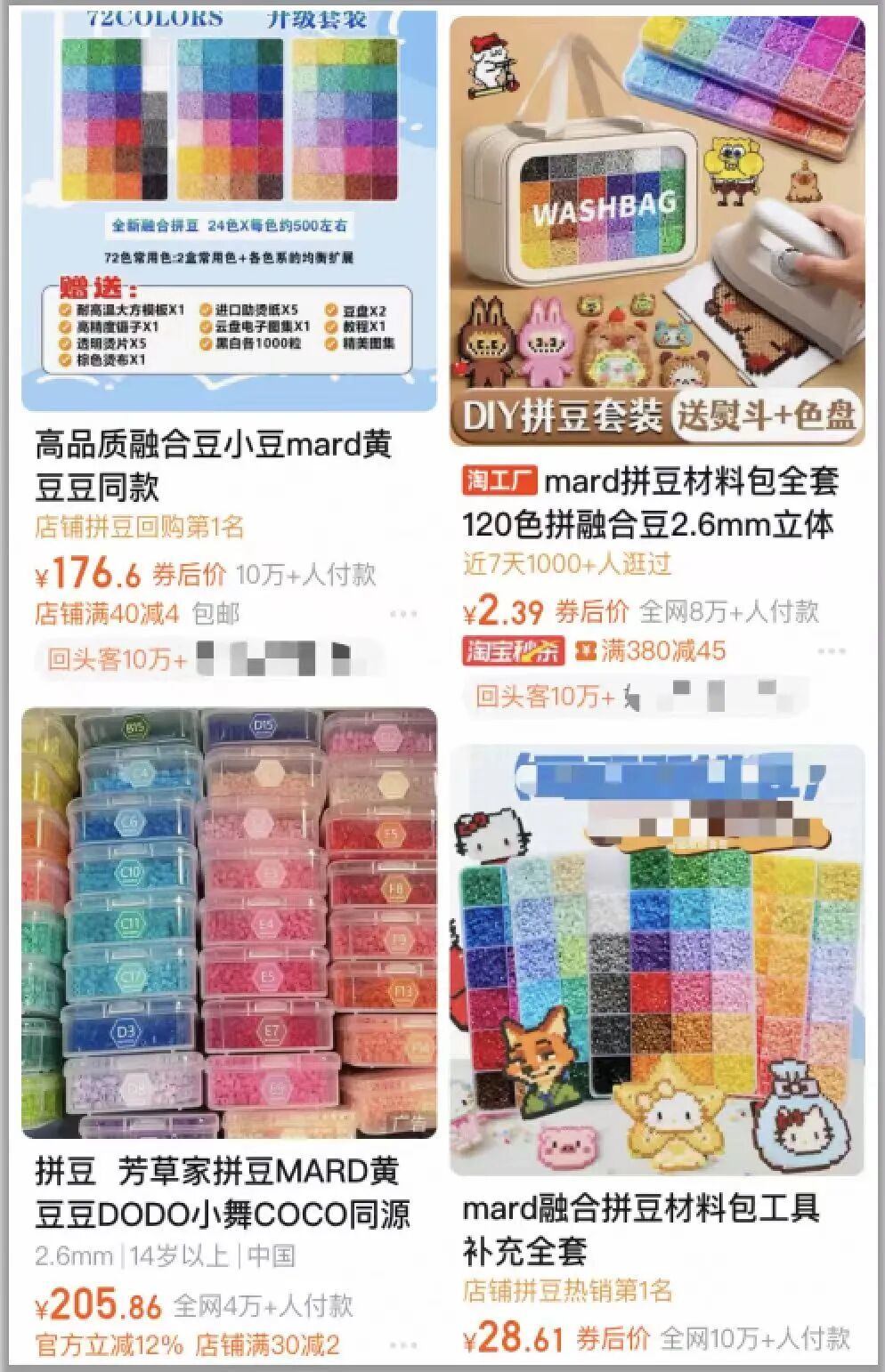 但如今,硕博级别的拼豆作品层出不穷,大家不仅越拼越卷,越拼越难,拼豆价格也水涨船高。即便如此,拼豆赛道上,依旧人满为患,直接带动了相关产品的销量激增。