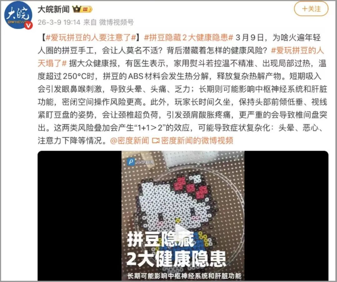 最近,一则关于拼豆安全问题的讨论冲上热搜。
