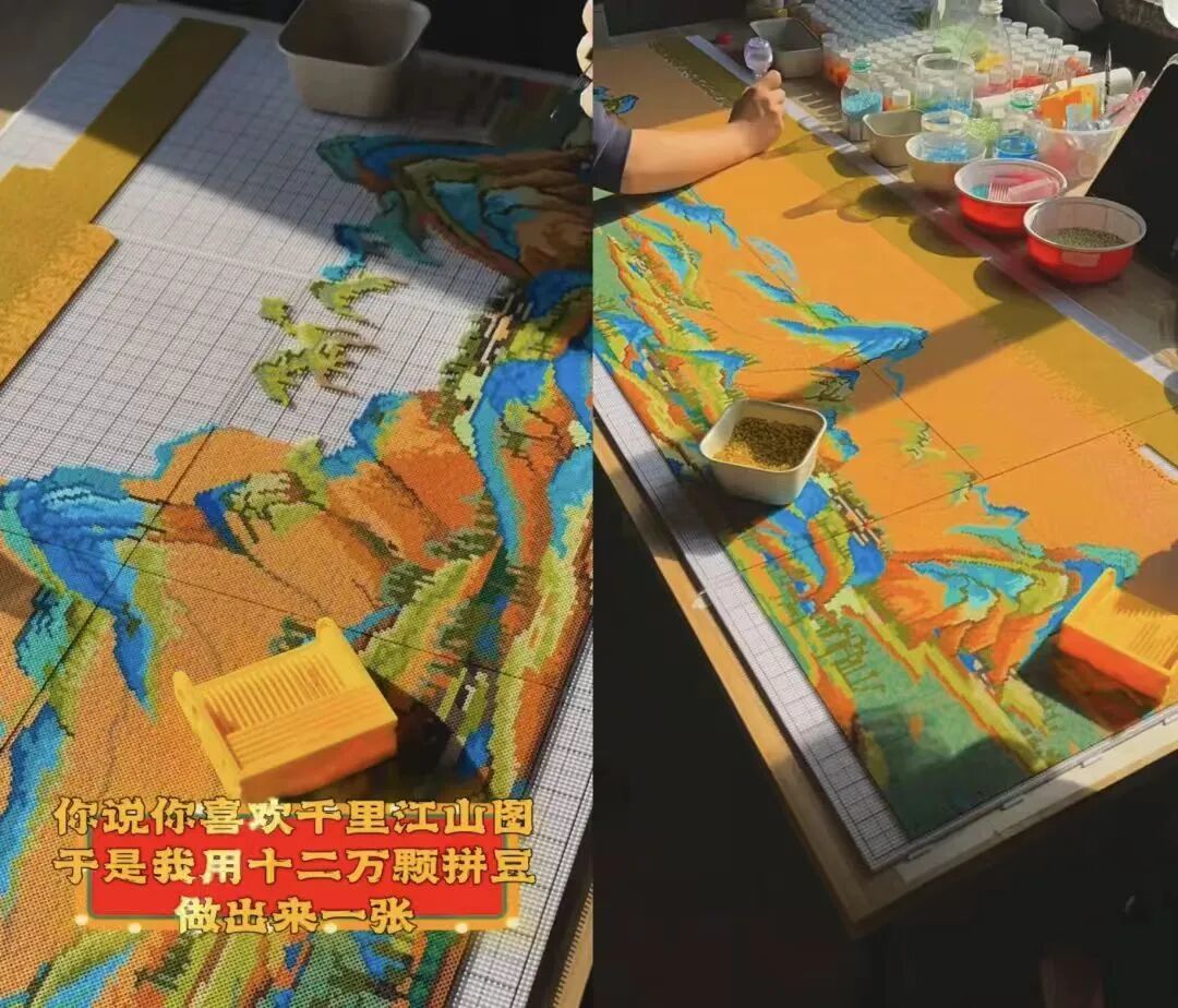 学美术出身的博主,耗时27天,花费了十二万颗拼豆,手搓出一幅《千里江山图》。他的这条视频获得了超过10万点赞,让很多人想起了当年被十字绣版《清明上河图》支配的恐惧。