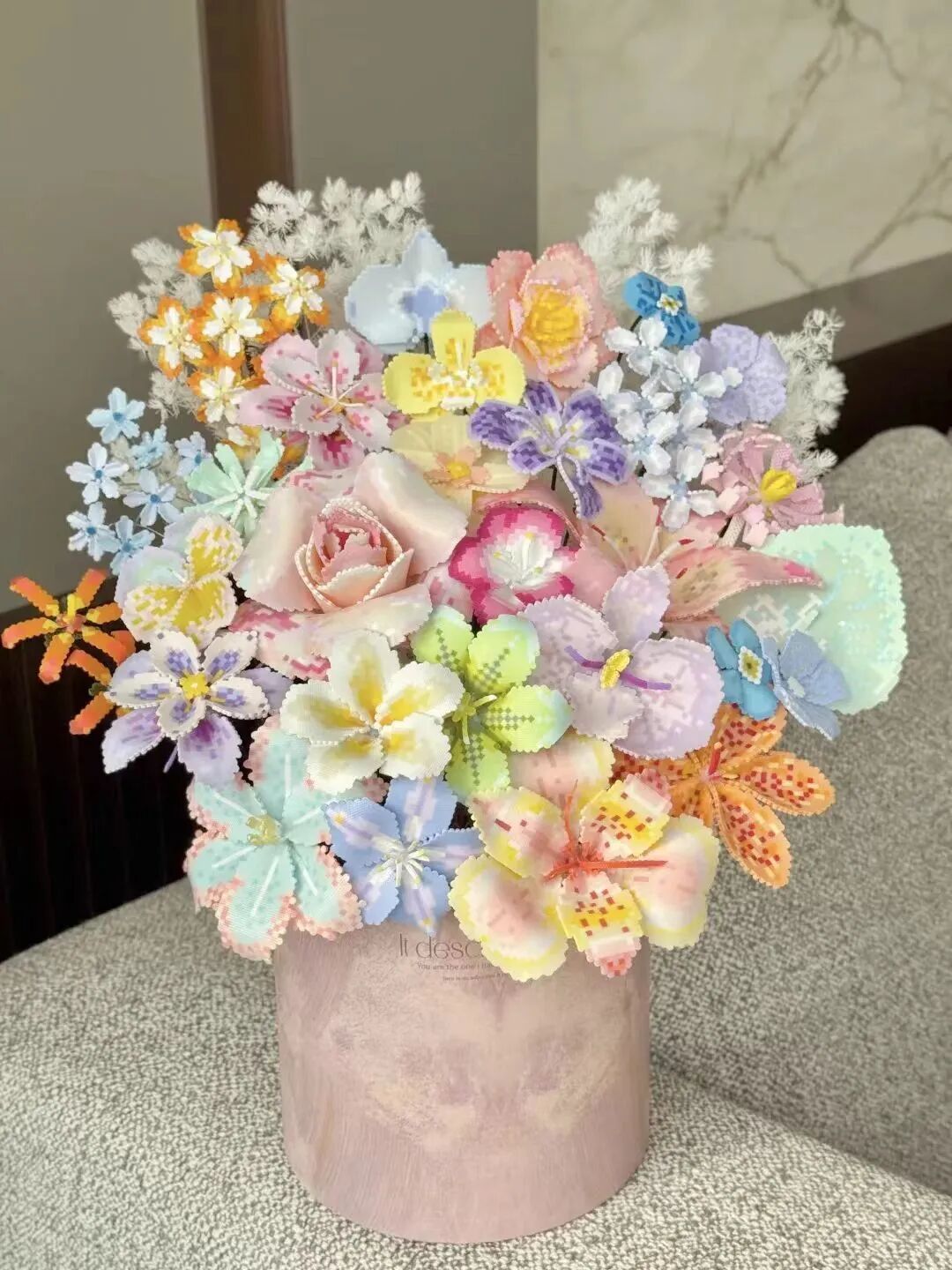 和很多手工比起来,拼豆操作简单,只需把豆子按照图纸放置在固定的位置,但它的成品却可以无上限,有人用拼豆做出逼真的鲜花抱抱桶,有人用拼豆复原了地方非遗花灯。