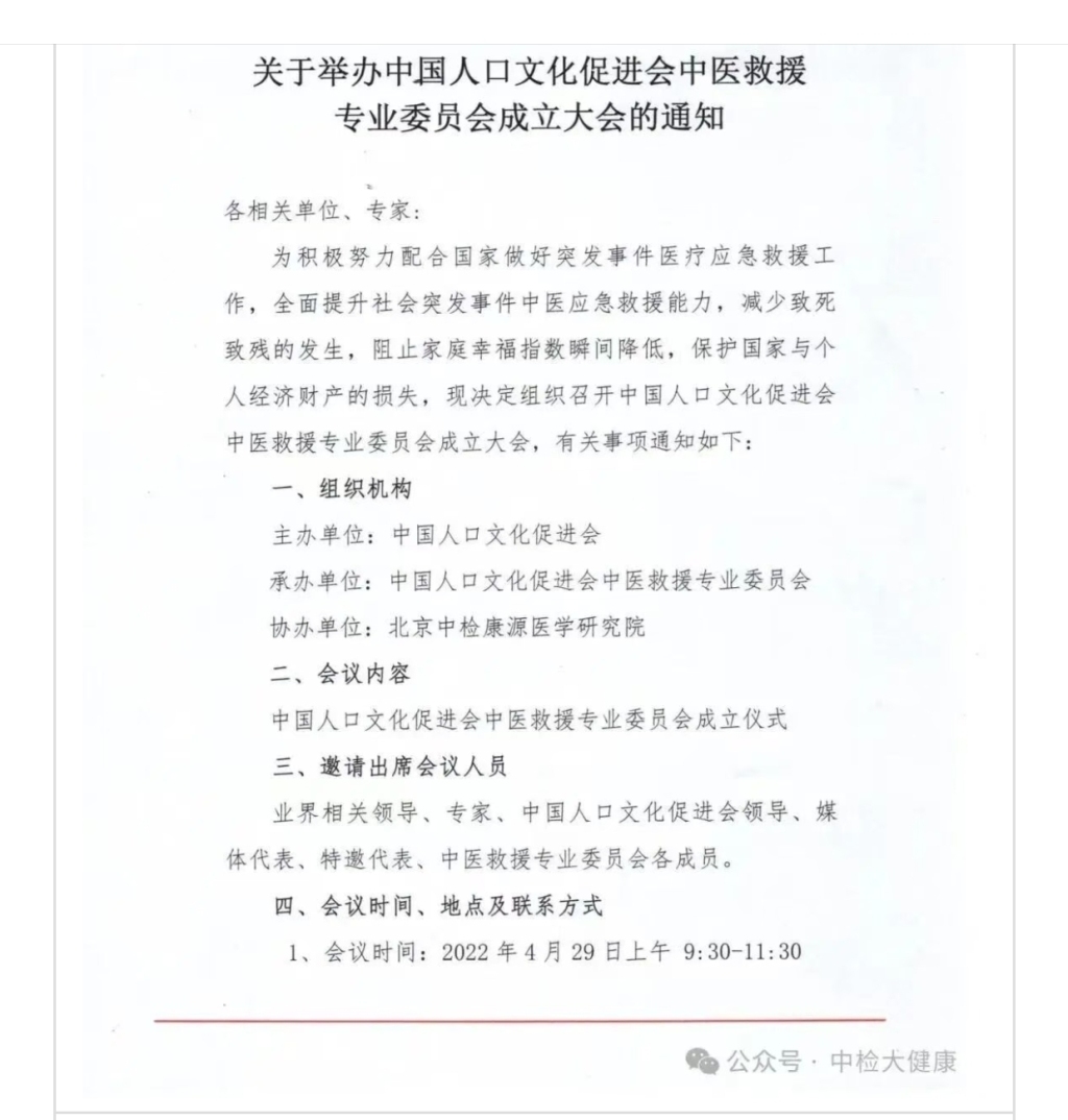 该《通知》显示,为积极努力配合国家做好突发事件医疗应急救援工作,全面提升社会突发事件中医应急救援能力,减少致死致残的发生,阻止家庭幸福指数瞬间降低,保护国家与个人经济财产的损失,现决定组织召开中国人口文化促进会中医救援专业委员会成立大会。该文件显示的会议时间是2022年4月29日上午。主办单位系中国人口文化促进会,承办单位系中国人口文化促进会中医救援专业委员会,协办单位是北京中检康源医学研究院。