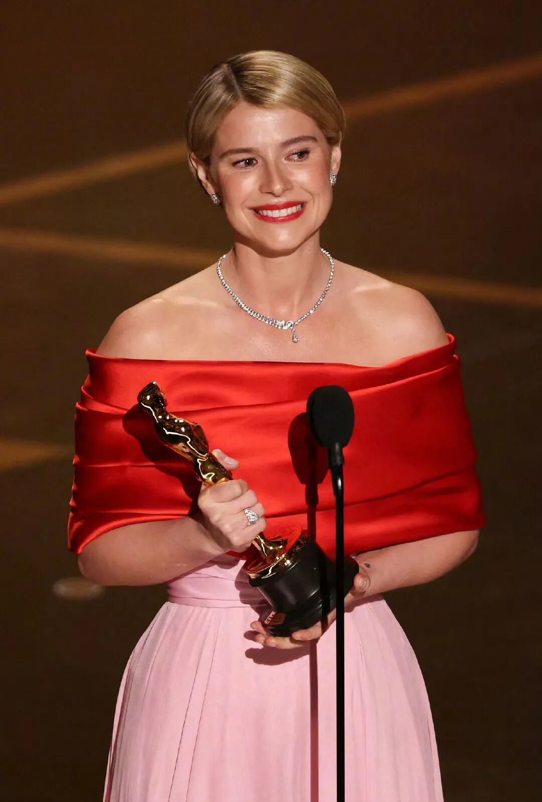 她身着一袭特别定制的Chanel礼服,巧妙致敬了1956年格蕾丝·凯利的经典奥斯卡红毯造型,并以爱尔兰历史上首位奥斯卡影后的身份,将自己的名字镌刻进了影史。