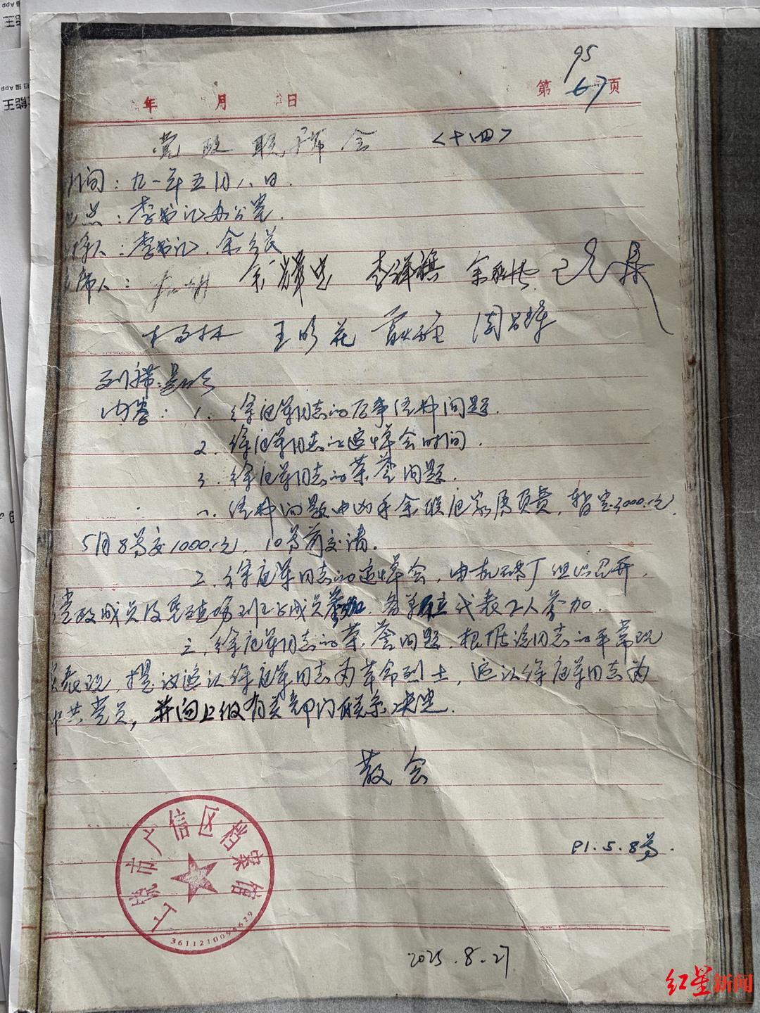 余某被抓后,让徐庭军家属看到了申报荣誉的希望。一份1991年5月8日的高泉乡会议记录显示:(提议)追认徐庭军同志为革命烈士,并向上级有关部门联系决定。汪天保提供的一份签字盖章的证人证言上,时任高泉乡党委副书记、纪委书记杨林回忆,当时对申报徐庭军为烈士这一事情,乡政府班子会议进行了专题研究,同意上报。由于余某没有落网,致使案件定性困难,所以申报徐庭军为烈士一事一直没有得到落实。如今真相大白,重启烈士申报之事,也是对徐庭军英灵的慰藉。