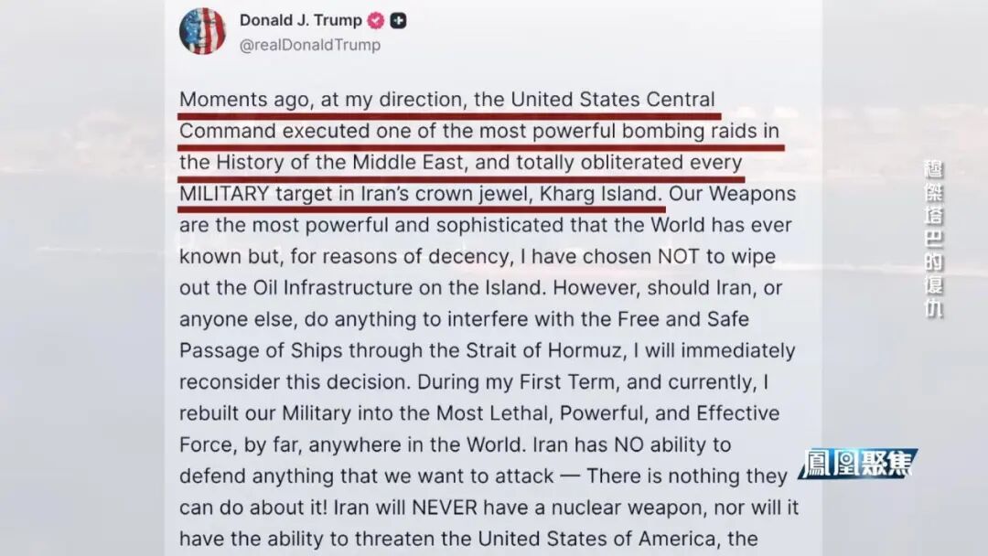眼见局势逐渐升级,特朗普迅速做出反应。3月13日,他在社交媒体发文称,美军中央司令部刚刚按照他的指示,轰炸了伊朗石油出口枢纽哈尔克岛,彻底摧毁岛上所有军事目标。
