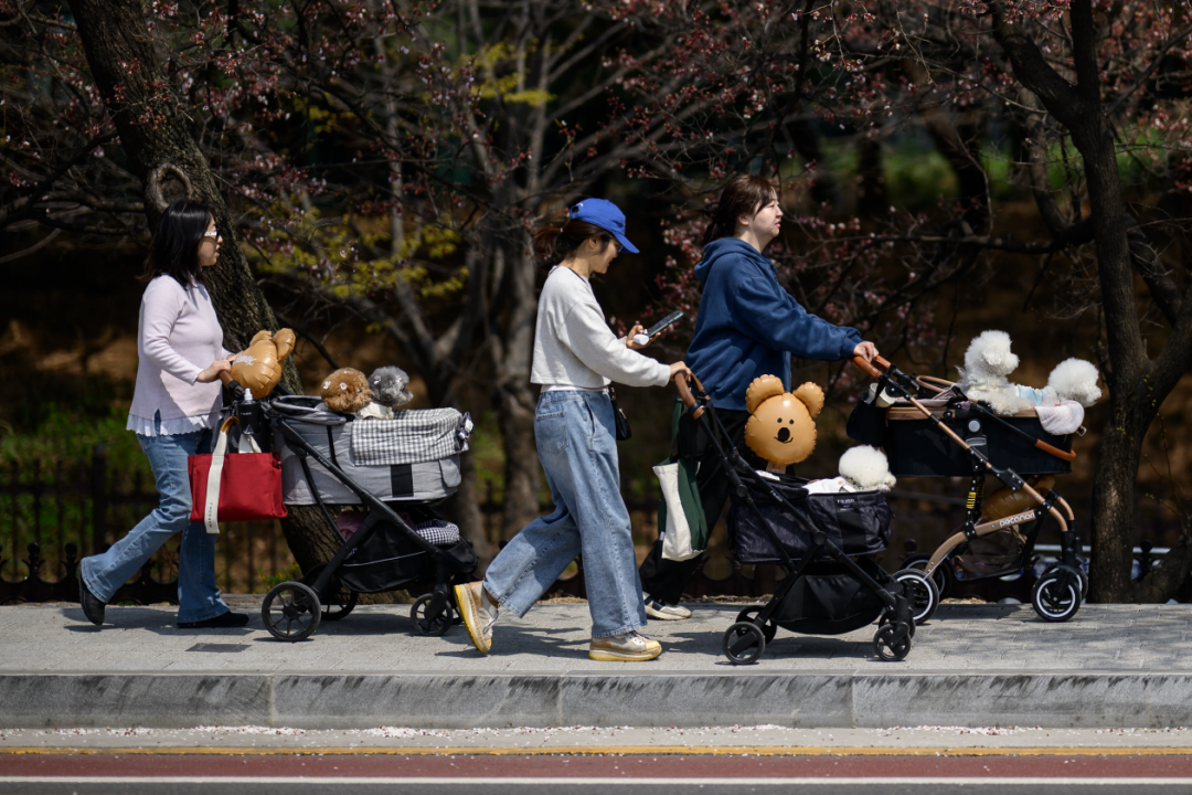 △2025年4月8日,首尔,几位女性推着宠物推车散步。敏智的女性朋友中,大部分人都想优先发展事业。(图源:法新社)