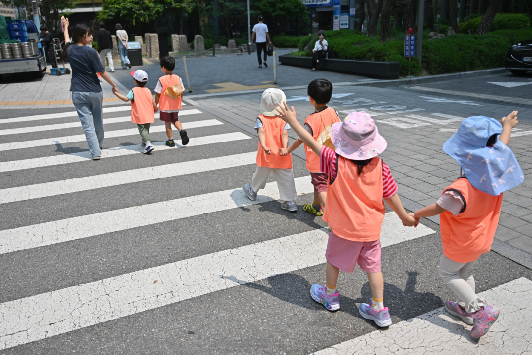 △2025年5月30日,孩子们穿过首尔的一条街道。(图源:《纽约时报》)