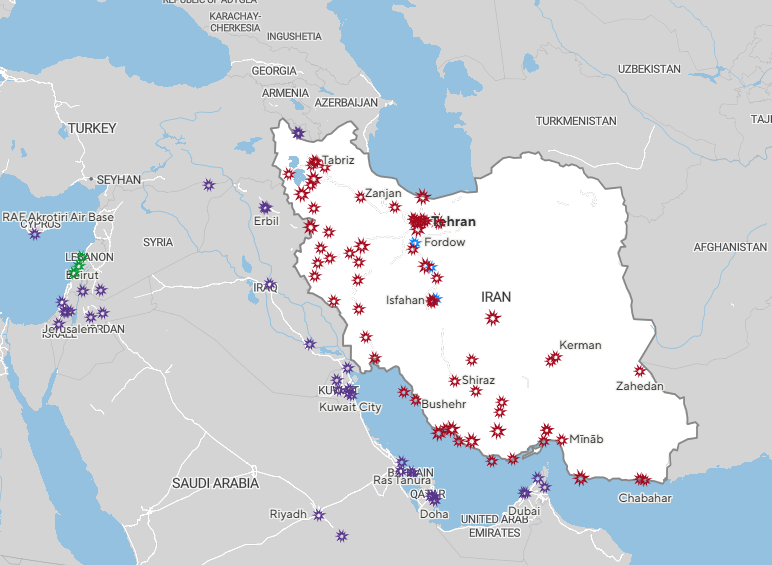 截止3月3日,美以轰炸地点(红色)、伊朗复仇打击点(紫色),绿色为以色列打击黎巴嫩,蓝色为2025年美国轰炸伊朗境内的核设施 CBS