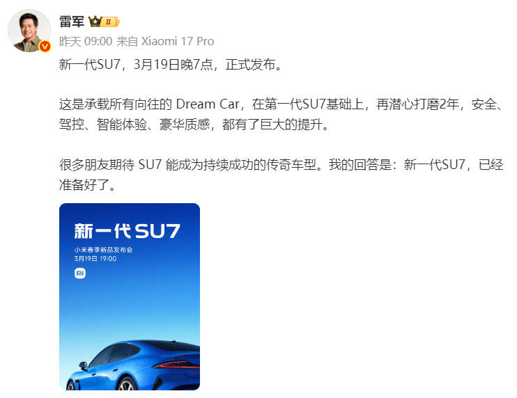 此前,雷军表示,新一代SU7,3月19日晚7点正式发布。这是承载所有向往的 Dream Car,在第一代SU7基础上,再潜心打磨2年,安全、驾控、智能体验、豪华质感,都有了巨大的提升。