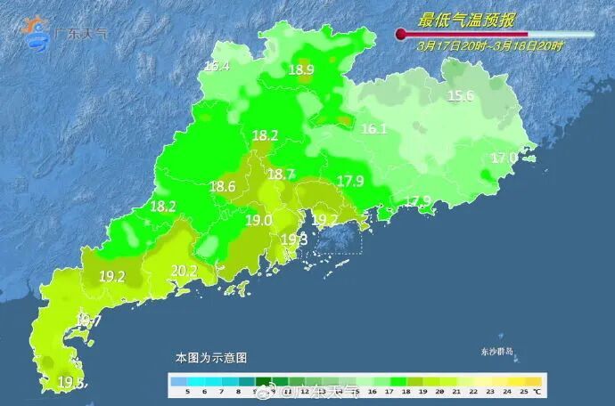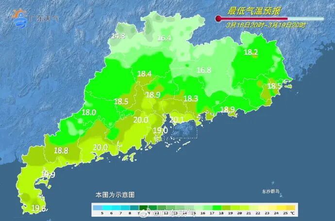 最低气温:粤北、珠三角北部和西部、粤东偏北市县12~16℃,雷州半岛市县19~21℃,其余市县16~19℃。