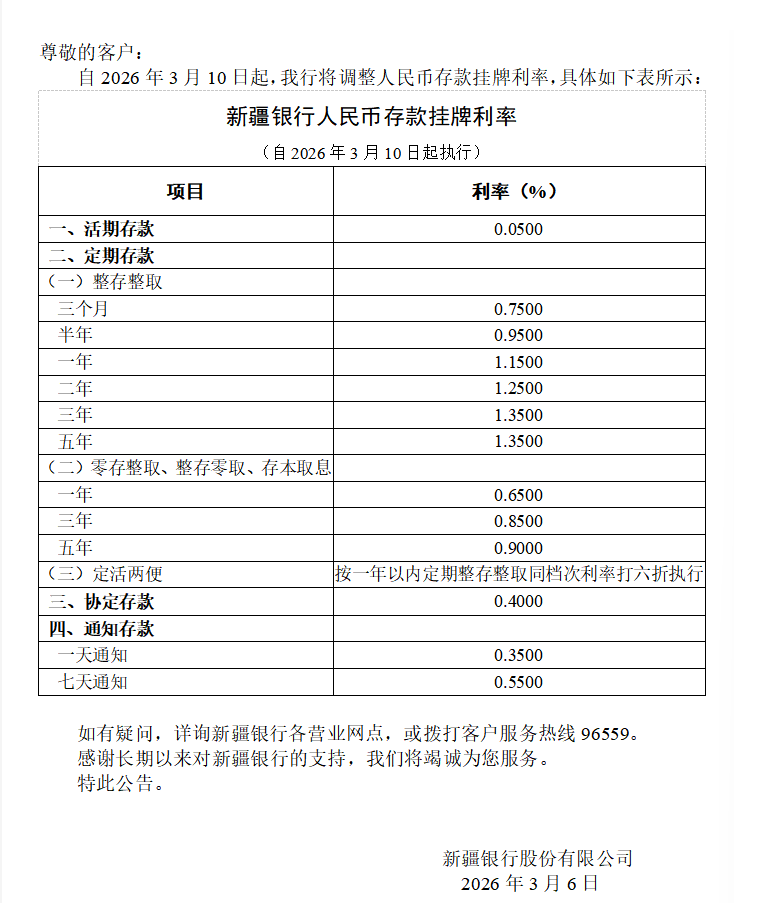 3月10日起,新疆银行实行新的人民币存款挂牌利率,相比去年5月,活期存款、定期存款整存整取、协议存款均有所下调。其公告称,一年期整存整取定期存款利率为1.15%、两年期1.25%、三年期1.35%、五年期1.35%,此前分别为1.25%、1.35%、1.45%、1.50%。