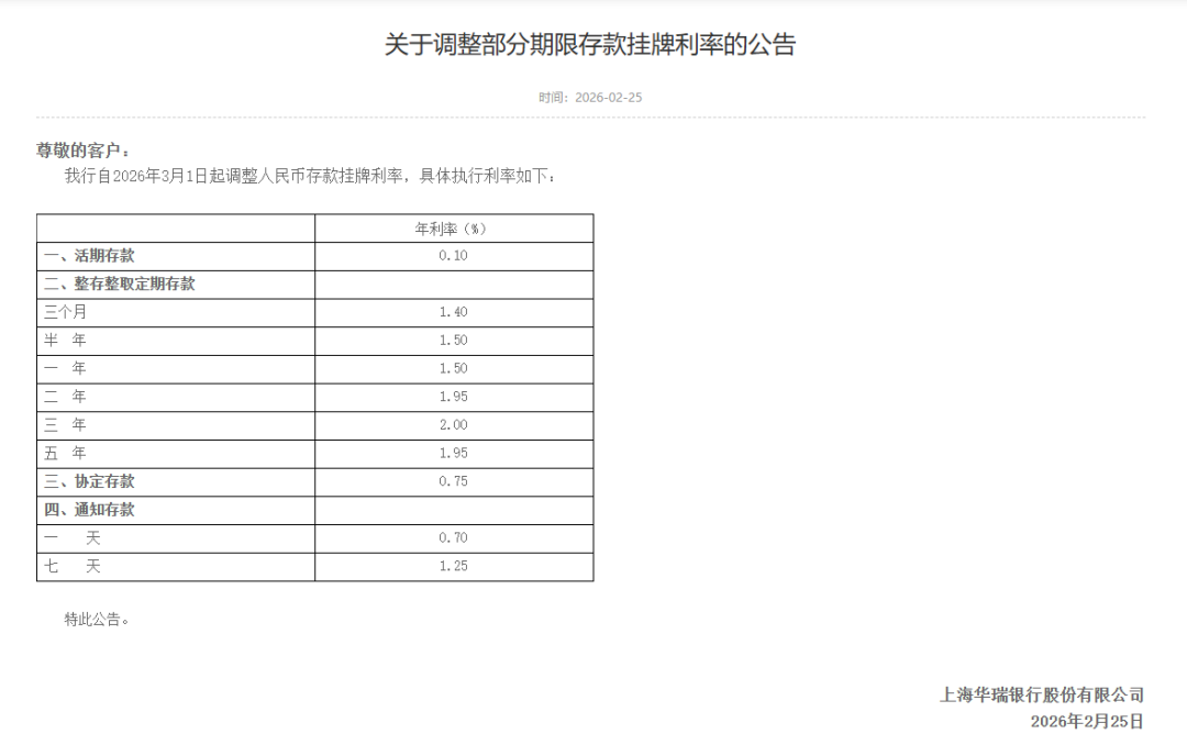 除了新疆银行,上海华瑞银行时隔4个月再次调整人民币存款挂牌利率。本月起,上海华瑞银行一年期定期存款调整为1.5%、两年期1.95%、三年期2.00%、5年期1.95%。此前,两年期为2.00%、三年期为2.05%、五年期为2.00%,均下调了5个基点,其中两年期与五年期利率正式跌破“2”字头。