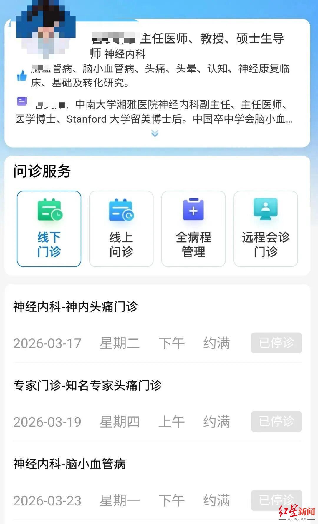 同时,红星新闻记者也在3月17日登录中南大学湘雅医院小程序预约挂号系统发现,疑似孙同学导师——该院神经内科副主任、主任医师谷某某已停诊。就此,红星新闻记者致电湘雅医院总机电话,但接线人员并未作出回应。