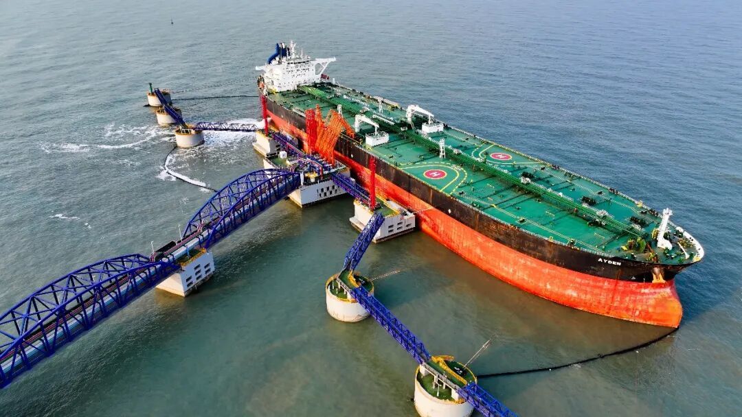 山东港口烟台港西港区原油码头,超大型油轮靠泊作业 / 新华社记者 李安 摄