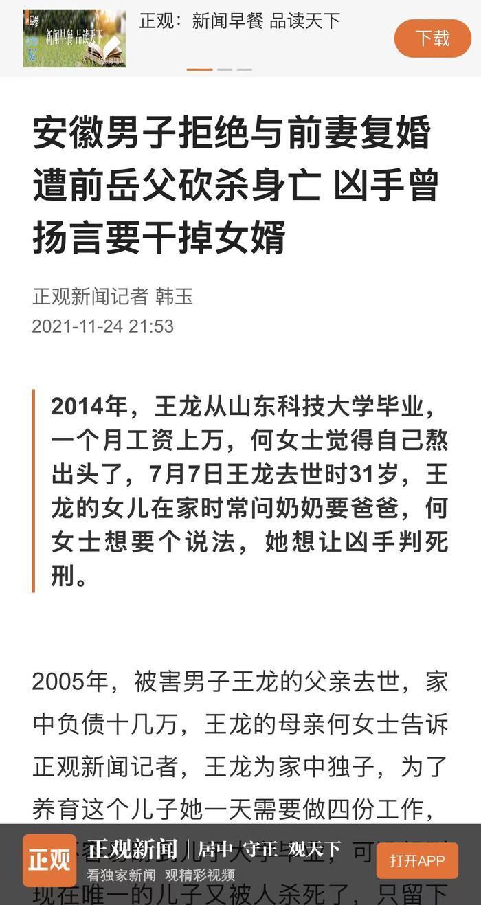 正观新闻自2021年11月开始报道此案,曾连续刊发《安徽男子拒绝与前妻复婚遭前岳父砍杀身亡?凶手曾扬言要干掉女婿》《追踪 | 安徽男子被前岳父砍杀案一审死者母亲:凶手不承认砍了25刀未当庭宣判》等相关报道。