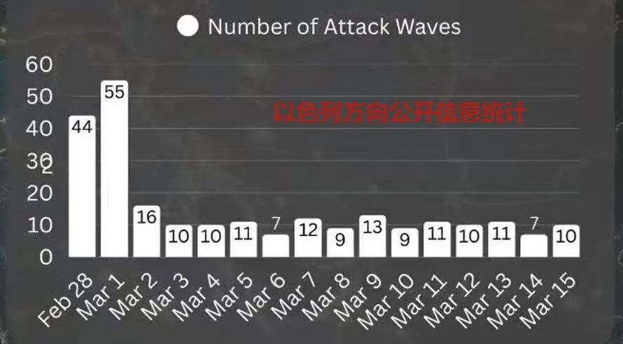 根据各方开源情报统计,伊朗在战争首日(2月28日)发射了约350枚弹道导弹/巡航导弹与800架自杀无人机,发动55波次攻击;至3月3日后,对以色列的日均发射量已降至不足20枚导弹与50架无人机,攻击波次降至10次以下。