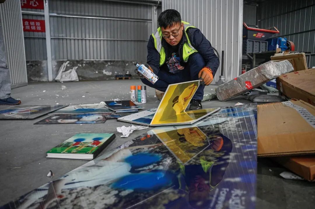 2024年3月27日,河北廊坊。离婚夫妻的婚纱照被喷漆销毁。这些婚姻破裂的夫妻,选择将回忆交给这个仓库。照片被放入工业粉碎机中,转化为电力资源。(图/CFP)
