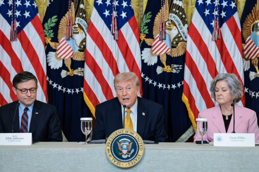 3月16日,特朗普在华盛顿白宫东厅与肯尼迪中心董事会成员共进午餐时发表讲话,批评盟友没有听从他的呼吁。