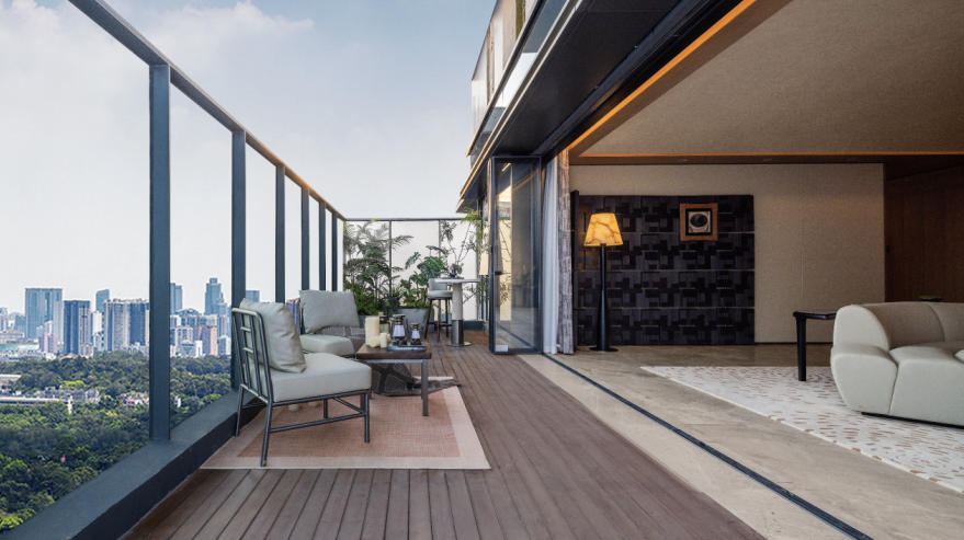 针对客户最关心的公摊面积占比问题,1号楼洋房户型以高得房率为核心优势,综合得房率最高可达142%,搭配丰富户型赠送,最大化挖掘空间价值;一户双庭的奢侈空中庭院设计,回应中原人对院落生活的向往,以私家空中院墅,让繁华与静谧在此完美相融。