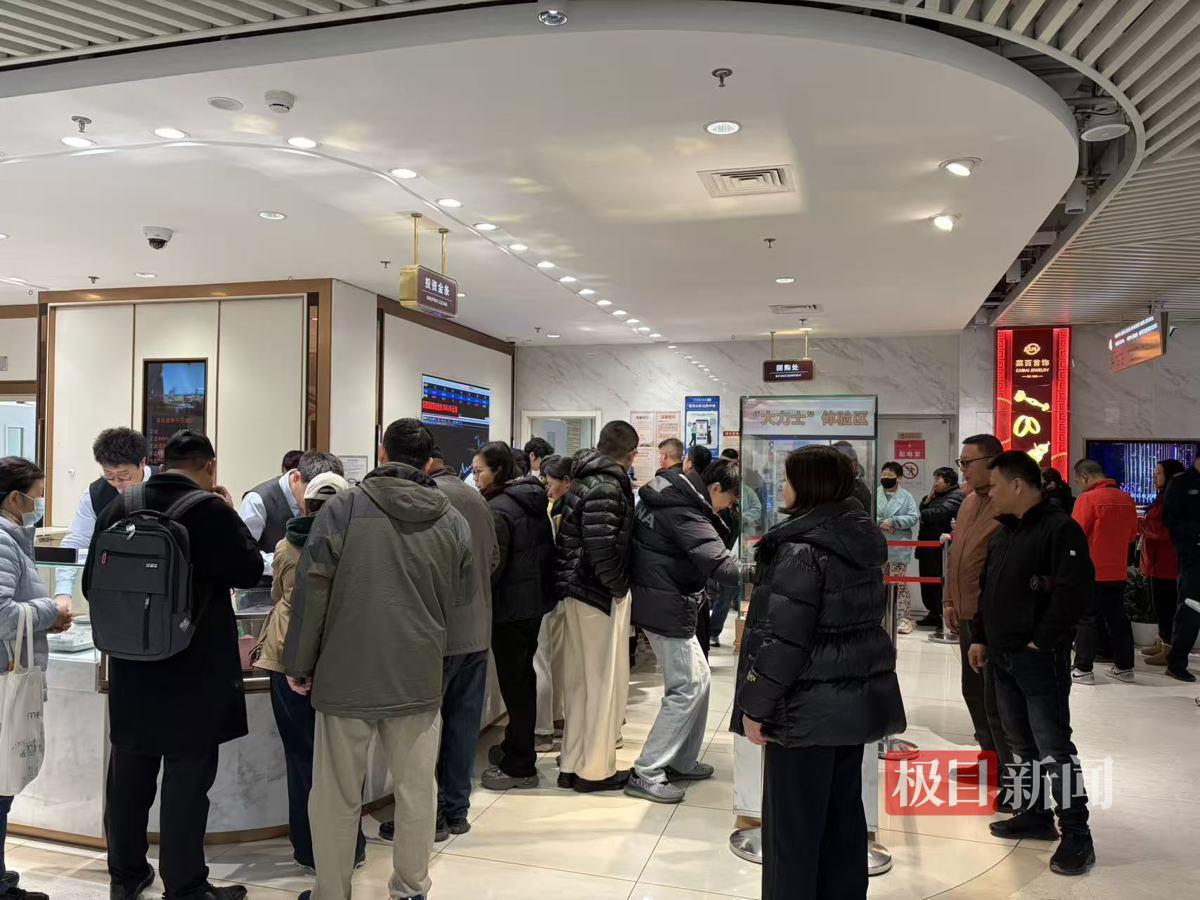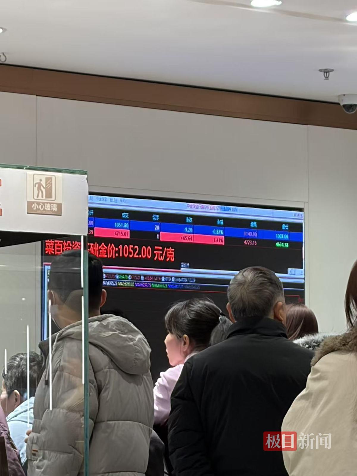 记者一进入四楼,就看到不少顾客已经在扶梯出口排起来长队,现场安保人员不停走动疏散人群维护秩序。10时24分许,现场显示屏上显示菜百投资基础金价为1045元/克。