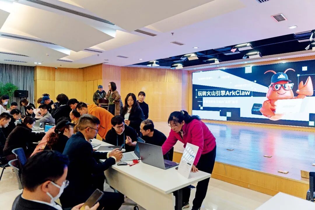 中图:3月12日,四川成都天府软件园的“AI龙虾”火山引擎ArkClaw活动现场。