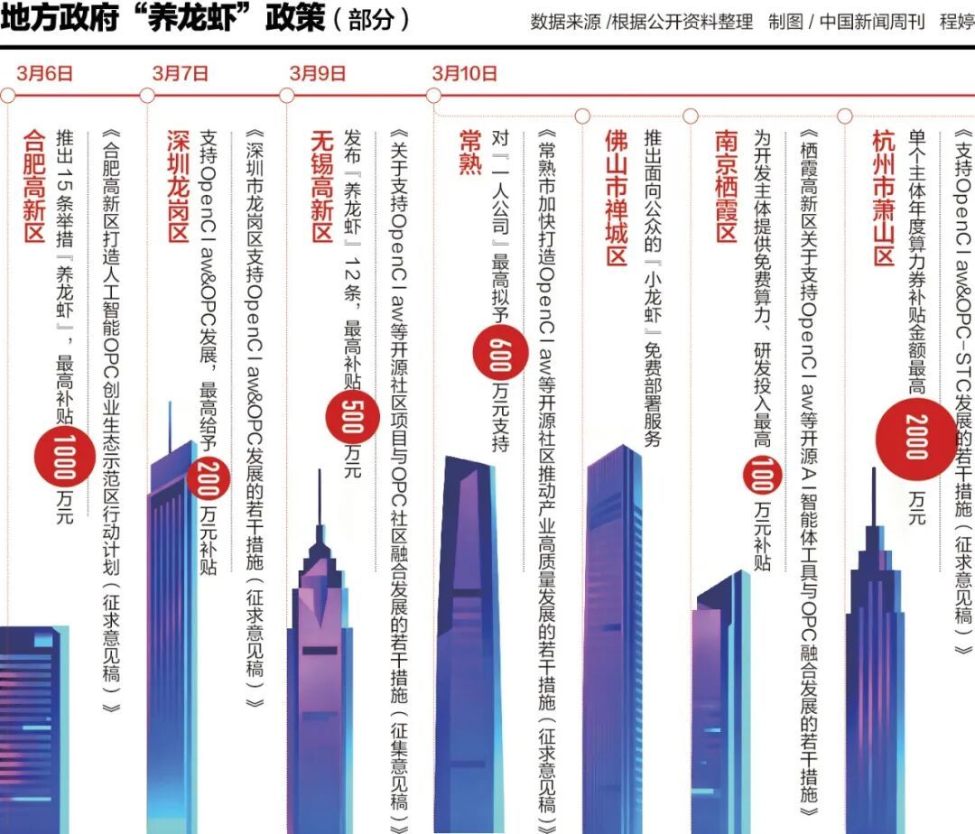 一些地方政府也“跑步入场”。3月7日,深圳市龙岗区率先发布《深圳市龙岗区支持OpenClaw&OPC发展的若干措施(征求意见稿)》(下称“AI龙虾十条”)。随后3天内,无锡市高新区、苏州常熟市、南京市栖霞高新区和江宁开发区、杭州市萧山区等地相继推出类似举措,将讨论热度推至新高。