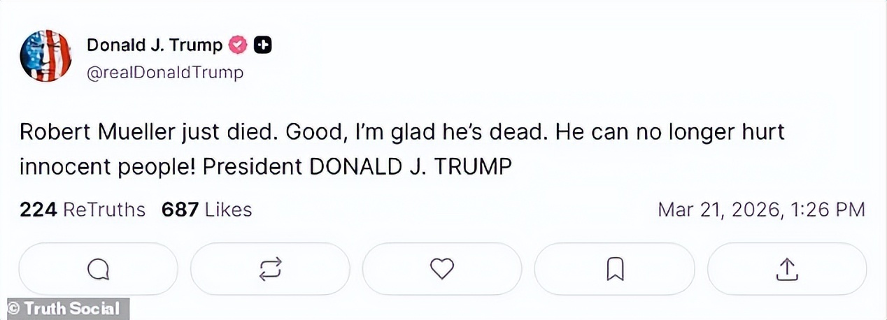 周五夜晚,他悄然离开,他的家人甚至都没有公布死因。然而,就在消息发布后的几分钟内,另一种声音迅速占据舆论中心:特朗普在社交媒体上写下——“很好,我很高兴他死了。”这句话,则是过去特朗普与穆勒十年政治恩怨的情绪爆发。
