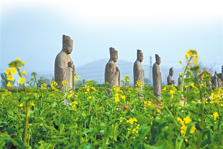 油菜花海中的宋陵石像生(3月17日摄)。均为河南日报全媒体记者 聂冬晗 摄