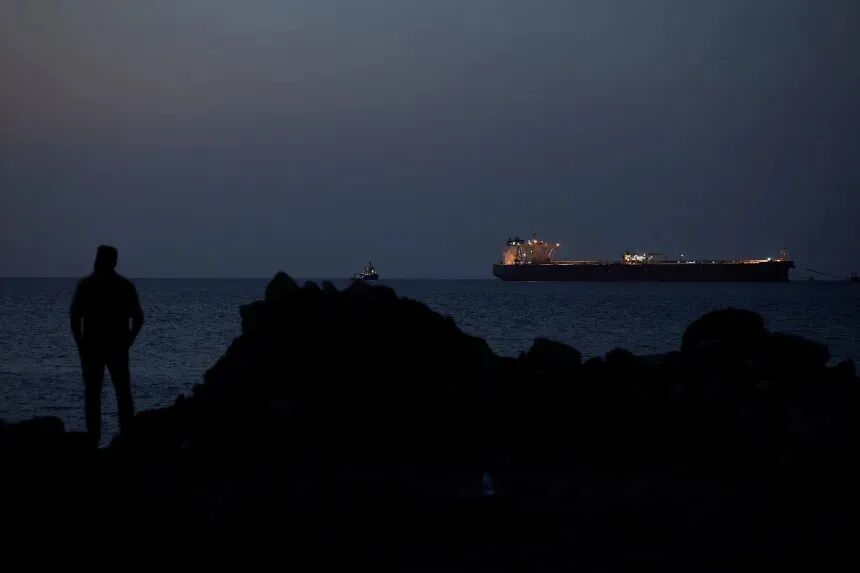 ▲霍尔木兹海峡交通中断,一艘油轮停泊在锚地。(图源:路透社)